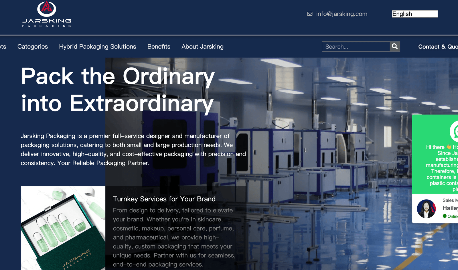 Descrição: Jarsking is a full-service custom packaging manufacturer focused on luxury, cosmetics, pharma, essential oils, and cannabis sectors. Offers complete design-to-delivery and rapid sample services.