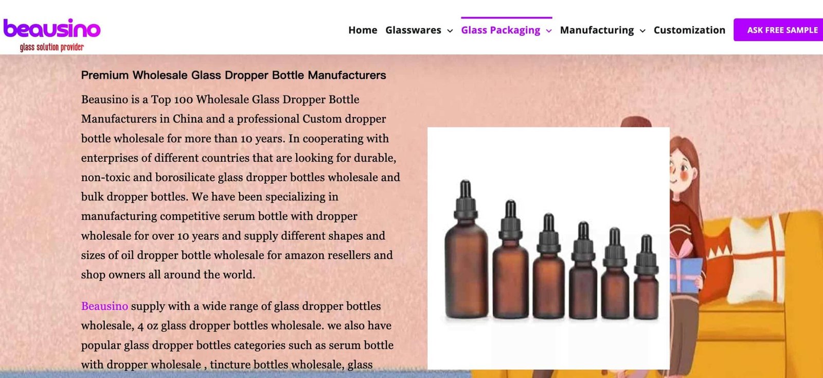 Descrição: Beausino is a top wholesale glassware factory (since 2007) offering direct custom solutions for dropper bottles, cosmetics, pharma, and food. Specializes in free samples and custom molding.